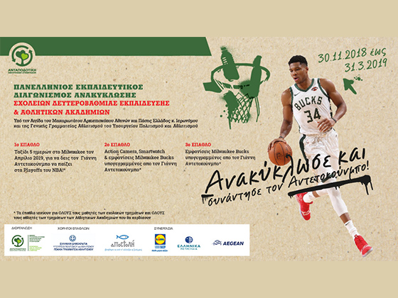 Στο πλαίσιο της ανάδειξης της δυναμικής της ανακύκλωσης σε Δήμους όλης της χώρας, διοργανώνει η Ανταποδοτική Ανακύκλωση για πρώτη φορά τον «Μεγάλο Πανελλήνιο Διαγωνισμό Ανακύκλωσης Σχολείων Δευτεροβάθμιας Εκπαίδευσης & Αθλητικών Ακαδημιών – Ανακυκλώνουμε μαζί με τον Γιάννη Αντετοκούνμπο» σε Δήμους όλης της χώρας.